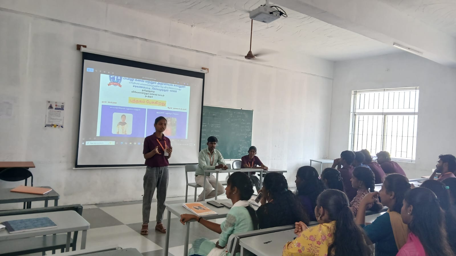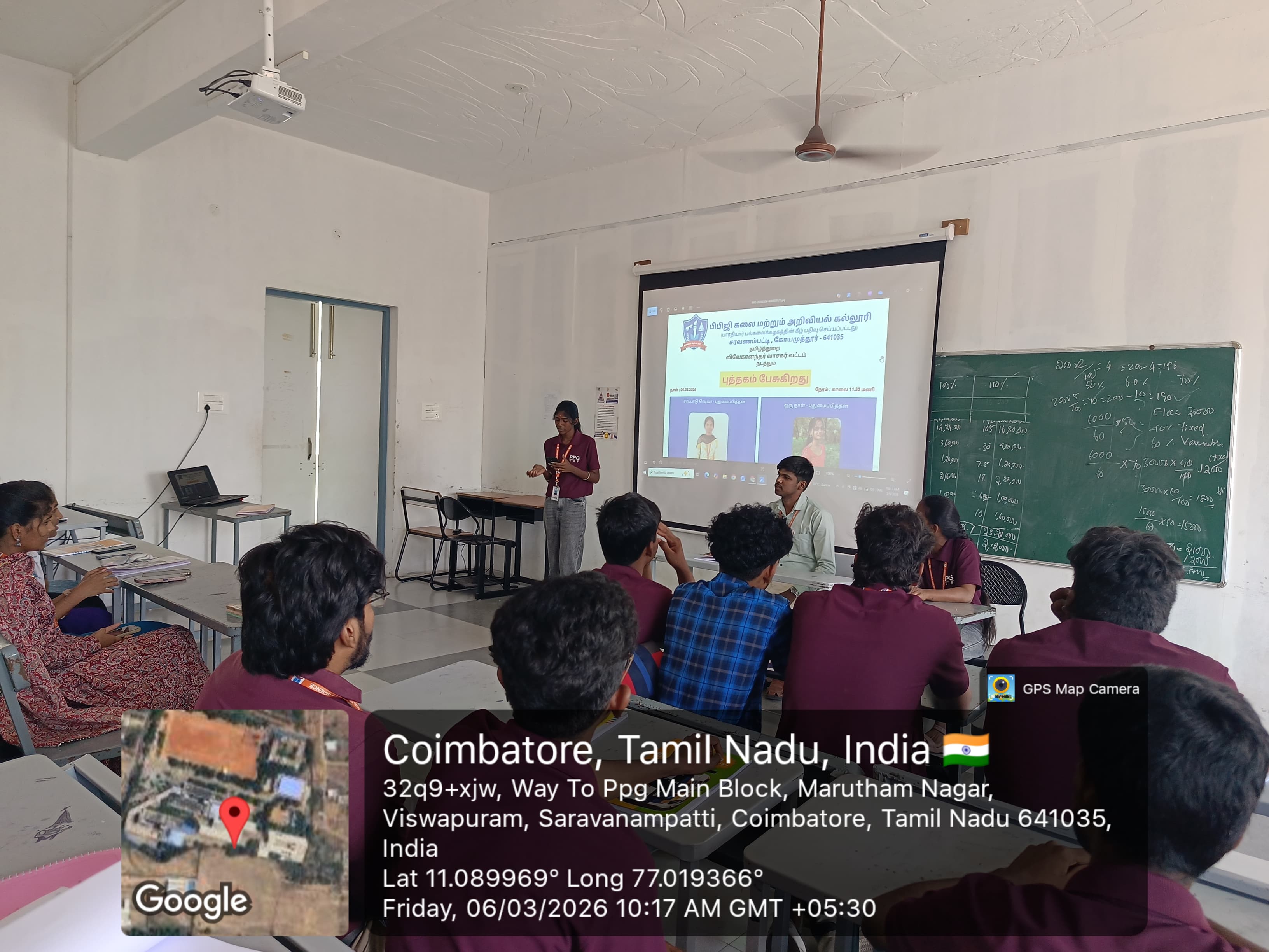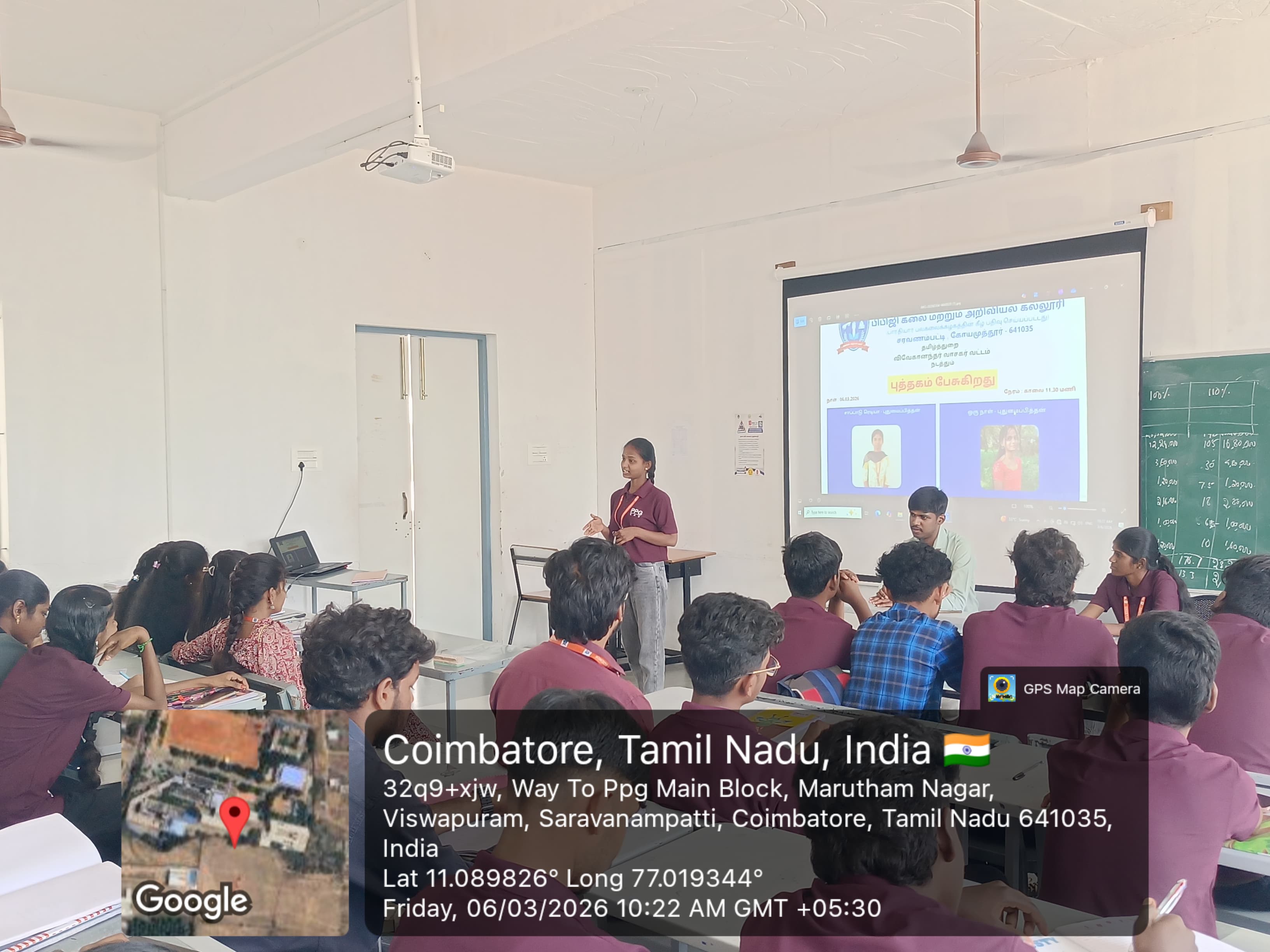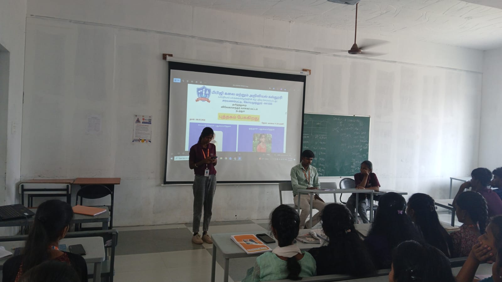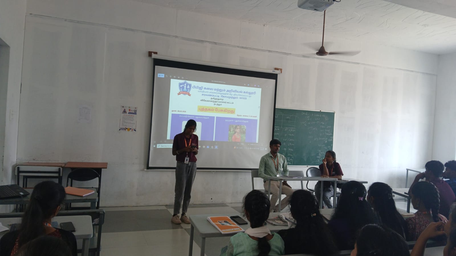 பிபிஜி கலை மற்றும் அறிவியல் கல்லூரி, தமிழ்த்துறை, விவேகானந்தர் வாசகர் வட்டம் சார்பாக புத்தகம் பேசுகிறது நிகழ்வானது 06.03.2026 அன்று நடைபெற்றது. இந்நிகழ்வில் முதலாம் ஆண்டு வணிகவியல் மற்றும் தொழில்முறை கணக்கில் மாணவிகளான செல்வி சர்வகா.க(சாப்பாடு ரெடியா), செல்வி கீர்த்தனா.ம (ஒரு நாள்) ஆகியோர்கள் சிறுகதையைக் கூறி சிறப்புரை வழங்கினார்கள். இந்நிகழ்வில் கணினி அறிவியல் துறை மாணவர்கள் கலந்து கொண்டு பயனடைந்தனர்.