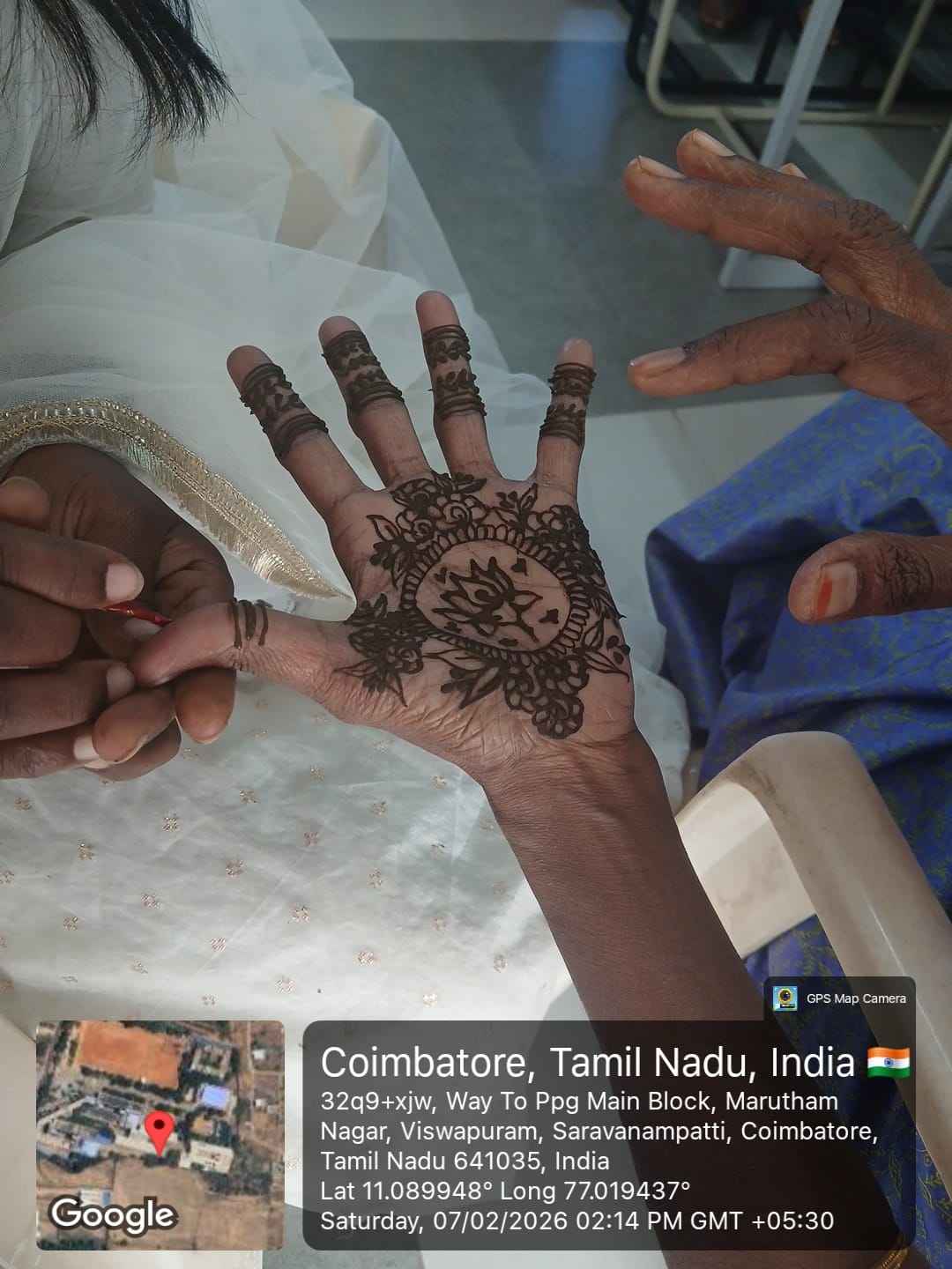 The Women Empowerment Cell organized a workshop on “Mehandhi Mastery” on the account Women’s Day Celebration 2026 for girl students. The resource person, Mrs. S. Pavithra, Proprietor of Bhavya Tailoring Institute and Fashion Designer, Mettupalayam, demonstrated various mehndi design techniques, including traditional and contemporary patterns. A total of 30 students from various departments participated in the workshop and were guided step-by-step on cone handling, line precision, shading, and detailing methods. The hands-on approach allowed students to practice designs in real time. This practical exposure significantly enhanced their artistic confidence and creativity. The workshop also created awareness about career opportunities in the field of mehndi artistry and fashion. Students gained insights into starting small businesses and earning independently through their skills. The session motivated participants to explore self-employment and entrepreneurship. It also strengthened their understanding of professionalism and client handling in the beauty industry.